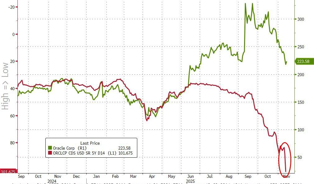 13F 的文件显示,第三季度,Appaloosa 和 David Tepper 的软银完全退出了甲骨文的持仓,而瑞典家族办公室 Rausing 和 Paul Allen 的财富管理机构则选择增持其持仓。在第三季度创下最大单日涨幅后,甲骨文股价已下跌约30%,五年期CDS利差已超过100个基点。